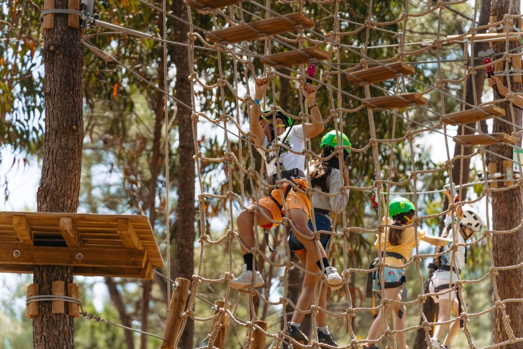We offer thrilling acrobatic courses through suspended bridges between trees, featuring a variety of attractions including zip lines, trapezes, and other surprises — all at an exciting height of 7 meters.